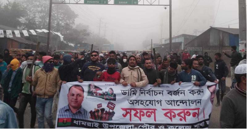 রবিবার (৩১ ডিসেম্বর) ধামরাই পৌর এলাকায় ধামরাই বাজারে আওয়ামী সরকারের পদত্যাগ ও নির্বাচনকালীন নির্দলীয় তত্ত্বাবধায়ক সরকার ব্যবস্থার পুণ:প্রতিষ্ঠার একদফা দাবীতে; নির্বাচন বর্জন ও অসহযোগ আন্দোলনের পক্ষে মিছিল করেছে ধামরাই থানা,পৌর যুবদল ও ছাত্রদলের ১ হাজারের অধিক নেতাকর্মীরা।