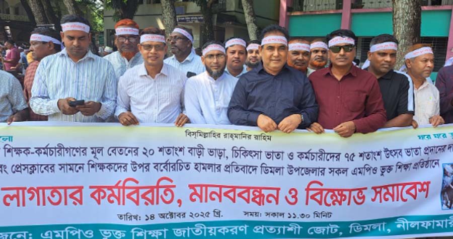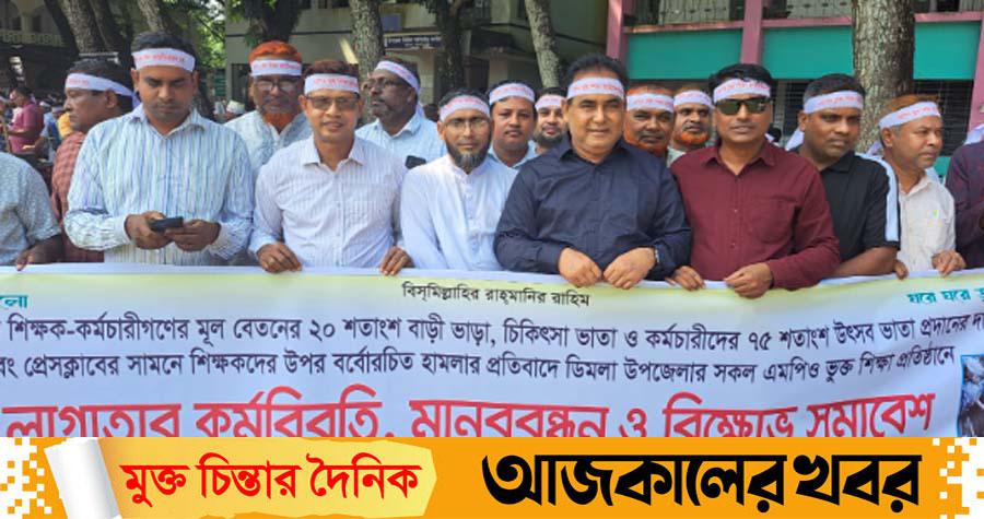 জাতীয় প্রেসক্লাবের সামনে এমপিওভুক্ত শিক্ষককর্মচারীদের অবরোধ কর্মসূচিতে পুলিশের হামলার প্রতিবাদ এবং তিন দফা দাবিতে নীলফামারী জেলা ডিমলা উপজেলায় এমপিওভুক্ত শিক্ষা জাতীয়করণ প্রত্যাশী জোটের বিক্ষোভ মিছিল ও সমাবেশ অনুষ্ঠিত হয়েছে।
