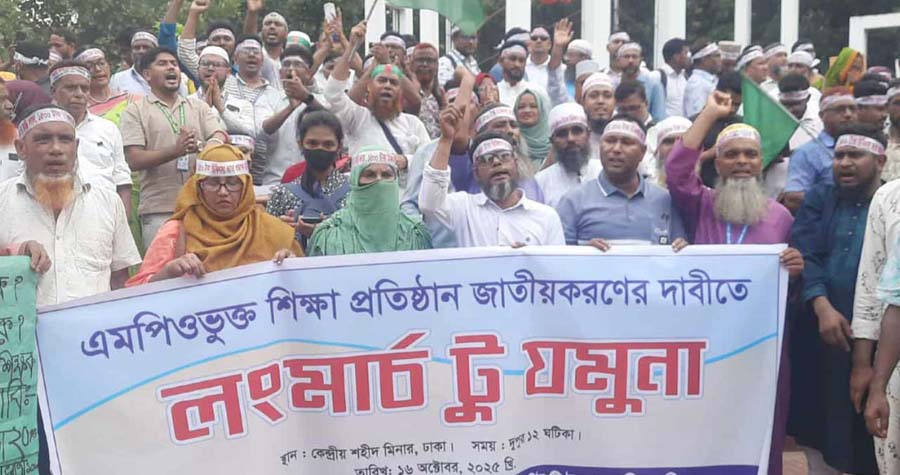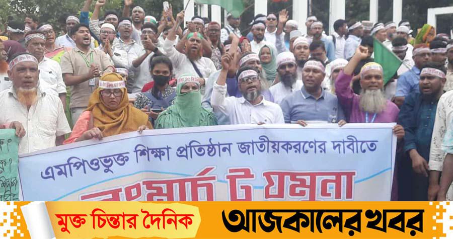 মূল বেতনের ২০ শতাংশ বাড়ি ভাড়াসহ তিন দফা দাবিতে বেসরকারি শিক্ষাপ্রতিষ্ঠানের এমপিওভুক্ত শিক্ষক-কর্মচারীরা টানা পঞ্চম দিনের মতো আন্দোলন চালিয়ে যাচ্ছেন। আজ দাবি আদায় না হলে ‘মার্চ টু যমুনা’ কর্মসূচি পালন করবেন আন্দোলনকারীরা। এরই অংশ হিসেবে লং মার্চের প্রস্তুতি নিচ্ছেন বলে জানিয়েছেন শিক্ষকরা।
