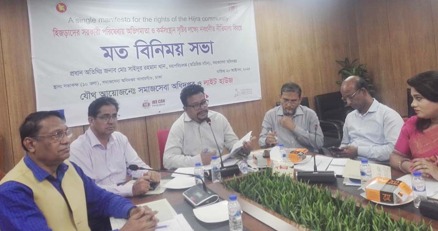সোমবার (২০ অক্টোবর) রাজধানীর আগারগাঁও সমাজসেবা অধিদপ্তর মিলনায়তনে সমাজসেবা অধিদপ্তর ও বেসরকারি সংস্থা লাইট হাউস যৌথ আয়োজিত হিজড়াদের সরকারি পরিষেবায় অভিগম্যতা ও কর্মসংস্থান সৃষ্টির লক্ষ্যে নবপ্রণীত নীতিমালা বিষয়ে মত বিনিময় সভায় এসব দাবি জানানো হয়।