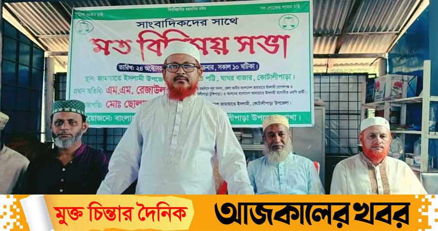 আপনারা সাংবাদিক জাতির বিবেক ৫৩ বছর বিভিন্ন সরকার এসেছে আপনাদের সাথে আমাদের যোগাযোগ হয়নি আপনারা আপনাদের সম্পর্কে জানুন বাংলাদেশ জামায়াতে ইসলামীর কর্মীরা কাউকে মামলা দিয়ে হয়রানি করেনা।উপজেলা জামায়াতের আমির ছোলায়মান গাজীর সভাপতিত্বে সভায় অন্যান্যদের মধ্যে বক্তব্য রাখেন জেলা জামায়েতের সেক্রেটারী আল মাসুদ খান,উপজেলা জামায়াতের সেক্রেটারী মাওলানা ফরিদ উদ্দিন মাসউদ,নায়েবে আমীর সেকেন্দার আলী,পৌর জামায়েতের সভাপতি আক্তার দাড়িয়া ও উপজেলা জামায়েতের কোষাধ্যক্ষ মাওলানা মহিবুল্লাহ।এসময় কোটালীপাড়ায় কর্মরত বিভিন্ন সংবাদ মাধ্যমের সংবাদকর্মীরা উপস্থিত ছিলেন।