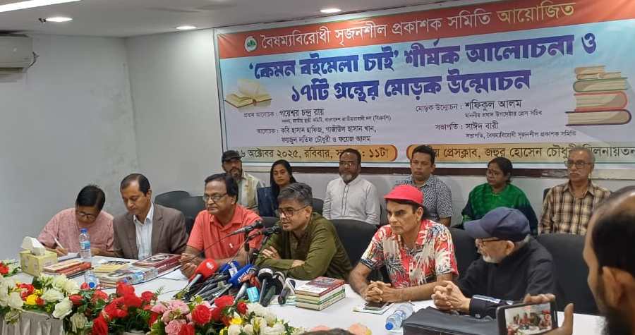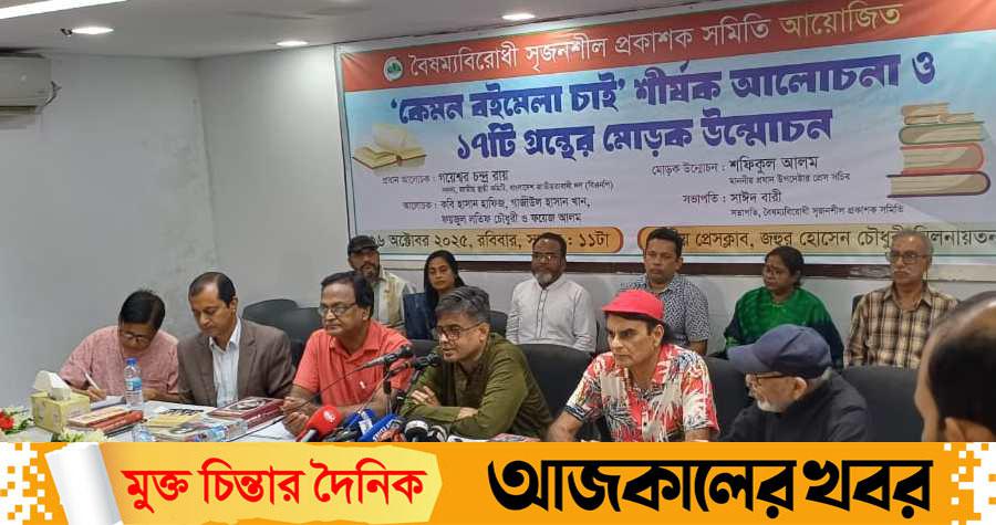 রবিবার (২৬ অক্টোবর) জাতীয় প্রেস ক্লাবে জহুর হোসেন চৌধুরী হলে বৈষম্যবিরোধী সৃজনশীল গ্রন্থ প্রকাশক সমিতির সভাপতি সাঈদ বারী’র সভাপতিত্বে কেমন বই মেলা চাই বিষয়ক এক সভা অনুষ্ঠিত হয়। সভায় অন্যান্যের মধ্যে বক্তব্য রাখেন- জাতীয় কবিতা পরিষদের সভাপতি মোহন রায়হান, প্রবীণ সাংবাদিক গাজীউল হাসান খান, লেখক গবেষক ফয়েজ আলম, সাংবাদিক লেখক সিরাজুল ইসলাম কাদির, সিনিয়র প্রকাশক গফুর হোসেন, কাজী জহিরুল ইসলাম বুলবুল, বেগম বদরুন্নেসা সরকারী কলেজের শিক্ষার্থী ফাতেমা আখতার, এআইইউবি’র শিক্ষার্থী দাহেকা আঞ্জুম সাদিয়া ও সংগঠনের সাধারণ সম্পাদক দেলোয়ার হাসান।