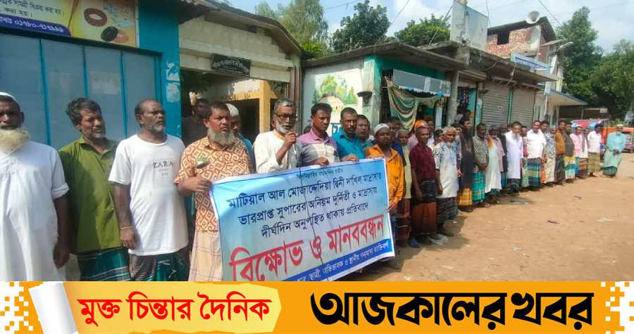 রবিবার (২৬ অক্টোবর) সকাল ১১টায় মাটিয়াল আল মোজাদ্দে দিয়া দ্বীনি দাখিল মাদরাসার মূল ফটকের সামনে ব্যানার হাতে নিয়ে দাড়িয়ে ঘন্টাব্যাপি বিক্ষোভ ও মানববন্ধন করেন শিক্ষার্থী, অভিভাবক ও এলাকার গণ্যমান্য ব্যাক্তিবর্গ। এর আগেও ভারপ্রাপ্ত সুপার আইয়ুব আলীর বিরুদ্ধে নানা অনিয়ম দুর্নীতি ও সেচ্ছাচারিতার অভিযোগে জেলা প্রশাসক, জেলা শিক্ষা অফিসার, উপজেলা নির্বাহী অফিসার ও উপজেলা শিক্ষা অফিসার বরাবর অভিযোগ দেয়া হয়, তদন্তও হয়। কিন্তু, তার বিরুদ্ধে কোনো ব্যবস্থা গ্রহণ না করায় ফুপে উঠেছে শিক্ষার্থী অবিভাবক ও এলাকার গন্যমান্য ব্যাক্তিবর্গ।