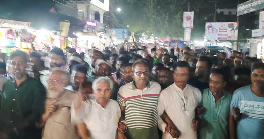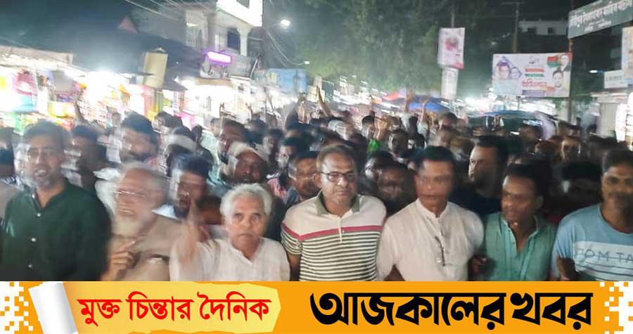 সোমবার রাতেই শহরের উত্তর বাজার থেকে বিক্ষোভ মিছিল বের হয়ে শহরের প্রধান সড়ক প্রদক্ষিণ করে পাটবাজারস্থ দলীয় কার্যালয়ে এসে শেষ হয়। পরে সেখানে প্রতিবাদ সমাবেশ অনুষ্ঠিত হয়।