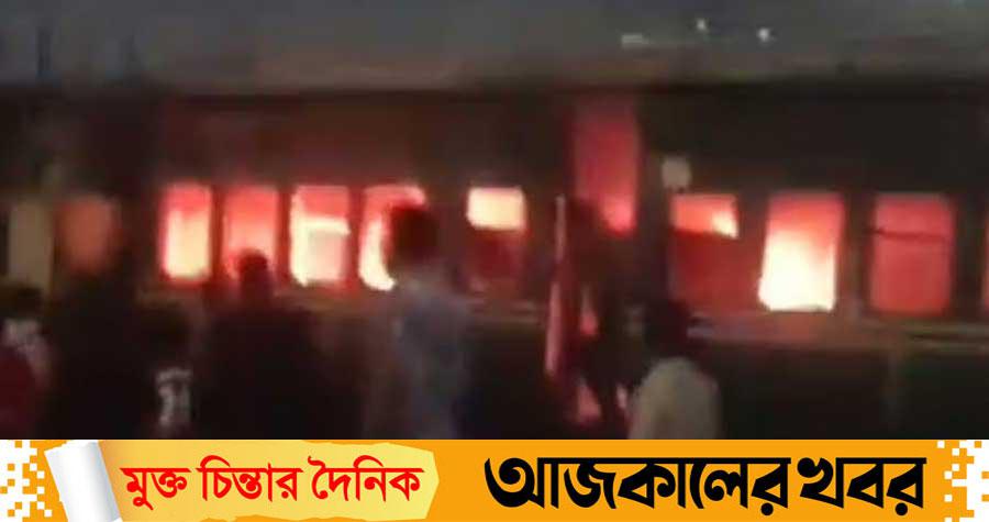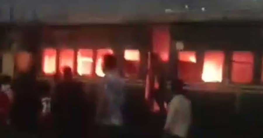 সামাজিক যোগাযোগ মাধ্যমে ছড়িয়ে পড়া একটি ভিডিওতে দেখা যায়, দাঁড়িয়ে থাকা একটি ট্রেনের খালি বগিতে আগুন জ্বলছে।