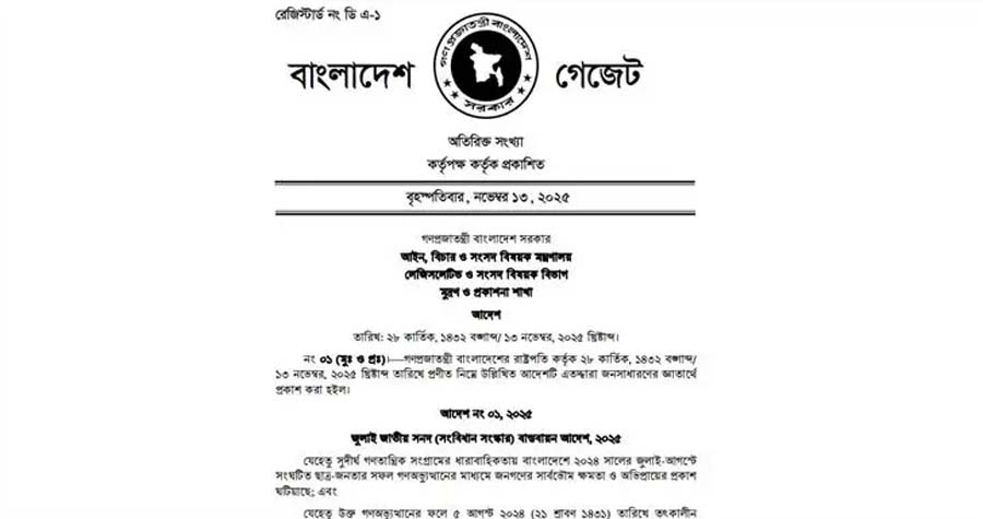 জাতীয় জুলাই সনদ (সংবিধান সংস্কার) বাস্তবায়ন আদেশ, ২০২৫ জারি করেছে সরকার। বৃহস্পতিবার (১৩ নভেম্বর) আইন, বিচার ও সংসদ বিষয়ক মন্ত্রণালয়ের লেজিসলেটিভ ও সংসদ বিষয়ক বিভাগ থেকে এ বিষয়ে গেজেট প্রকাশ করা হয়েছে।