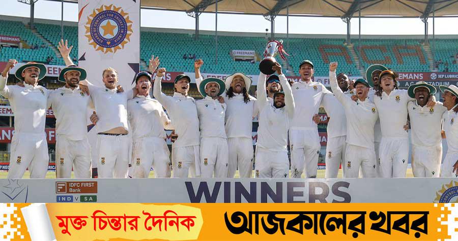 কেশব মহারাজের বল সপাটে বাউন্ডারি ছাড়া করতে চাইলেন মোহাম্মদ সিরাজ। ক্রিজে তখন ভারতের শেষ জুটি। কোনো ধরনের প্রতিরোধ না গড়ে মারমুখী সিরাজ। মিড অন থেকে প্রাণপণে বল ধরার জন্য সীমানার দিকে দৌড় দিলেন মার্কো জানসেন। উল্টো দিক থেকে বল হাতে নিয়ে মাটিতে পড়ে গেলেন, তবে হাতে থাকল বল। তার দিকে দৌড়ে এলেন সতীর্থ, টেম্বা বাভুমার যেন বিশ্বাসই হচ্ছিল না এমন ক্যাচ নেওয়া যায়! এই অবিশ্বাস্য ক্যাচে ভারতকে দ্বিতীয় ইনিংসে ১৪০ রানে অলআউট করে ৪০৮ রানে গুয়াহাটি টেস্ট জিতল দক্ষিণ আফ্রিকা।