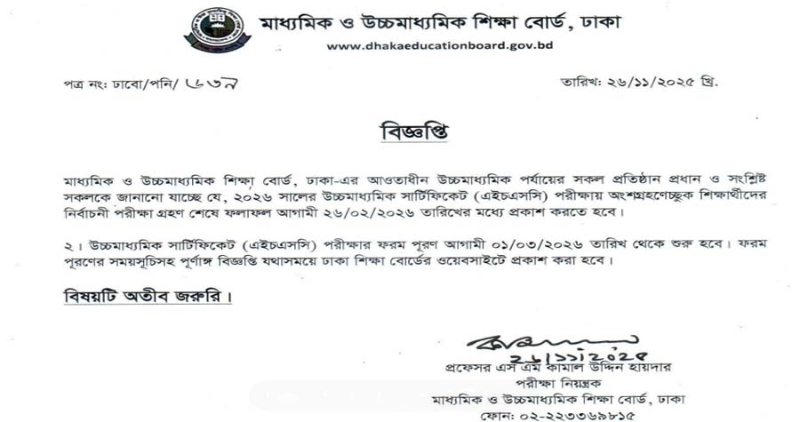 বিজ্ঞপ্তিতে বলা হয়, ২০২৬ সালের উচ্চ মাধ্যমিক স্কুল সার্টিফিকেট (এইচএসসি) ও সমমানের নির্বাচনী পরীক্ষার ফল আগামী ২৬ ফেব্রুয়ারির মধ্যে প্রকাশ করতে হবে। আর এইচএসসি পরীক্ষার ফরম পূরণ ১ মার্চ থেকে শুরু হবে।