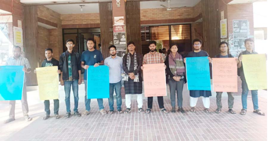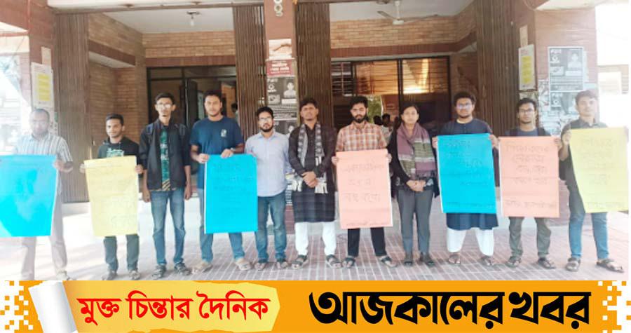 বৃহস্পতিবার (২৭ নভেম্বর) দুপুর দেড়টার দিকে বিশ্ববিদ্যালয়ের নতুন প্রশাসনিক ভবনের সামনে মানববন্ধন করেন তারা। মানববন্ধনটি সঞ্চালনা করেন জাতীয় ছাত্রশক্তি বিশ্ববিদ্যালয় শাখার সংগঠক কাজী মেহরাব তূর্য।