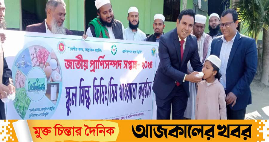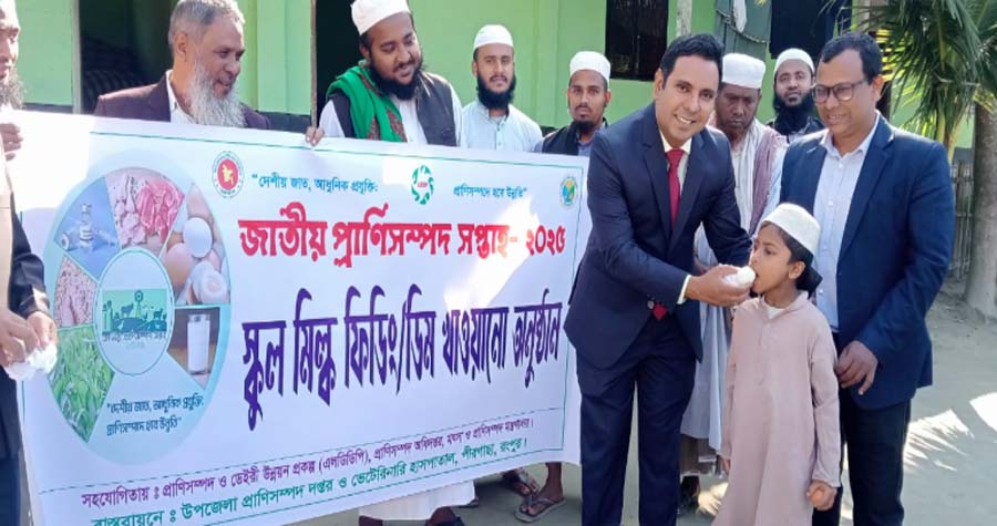 জাতীয় প্রাণিসম্পদ সপ্তাহ উপলক্ষে ‘দেশীয় জাত আধুনিক প্রযুক্তি, প্রাণি সম্পদে হবে উন্নতি" এই প্রতিপাদ্যে পালিত স্কুল ফিডিং কর্মসূচিতে দুধের সঙ্গে ডিম যুক্ত করার অংশ হিসেবে পীরগাছার পাকার মাথা দারুল উলুম মাদ্রাসার শিক্ষার্থীদের ফ্রি খাওয়ালো উপজেলা প্রাণী সম্পদ বিভাগ।