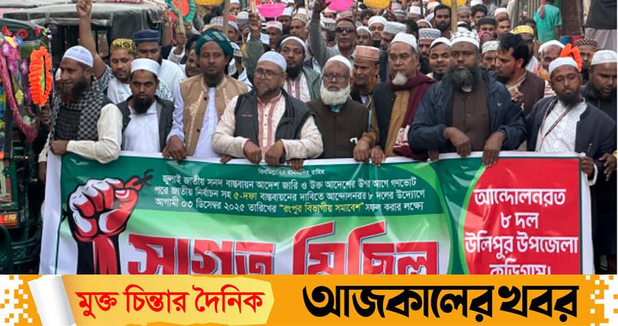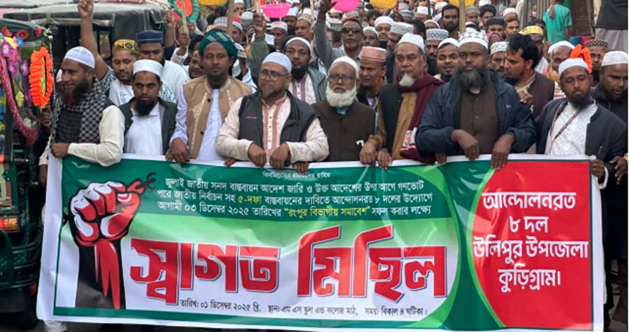 কুড়িগ্রামের উলিপুরে আন্দোলনরত সমমনা ৮ ইসলামী দলের উদ্যোগে এক বিশাল স্বাগত মিছিল অনুষ্ঠিত হয়েছে। সোমবার (১ ডিসেম্বর) বিকালে মহারানী স্বর্ণময়ী স্কুল ও কলেজ চত্বর থেকে বর্ণাঢ্য মিছিলটি যাত্রা শুরু করে পৌর শহরের প্রধান সড়কগুলো প্রদক্ষিণ শেষে পোস্ট অফিস মোড়ে সমাবেশে রূপ নেয়।