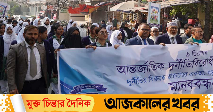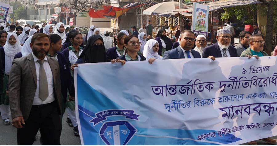 মঙ্গলবার (৯ ডিসেম্বর) আন্তর্জাতিক দুর্নীতি বিরোধী দিবস ২০২৫ উপলক্ষে অনুষ্ঠিত মানববন্ধন ও র্যালির আয়োজক ছিলেন ঢাকা মহানগর দুর্নীতি প্রতিরোধ কমিটি, উত্তরা অঞ্চল।