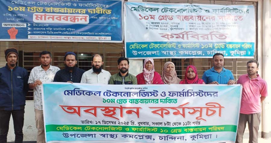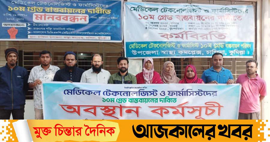 কুমিল্লার চান্দিনায় ১০ম গ্রেড বাস্তবায়নের দাবিতে অবস্থান কর্মসূচি পালন করেছেন মেডিকেল টেকনোলজিস্ট ও ফার্মাসিস্টরা।