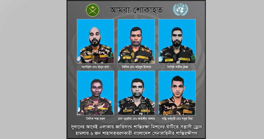 সুদানে জাতিসংঘ শান্তিরক্ষা মিশনে সন্ত্রাসী ড্রোন হামলায় নিহত ৬ বাংলাদেশি শান্তিরক্ষীর মরদেহ আজ (২০ ডিসেম্বর) আনা হচ্ছে স্বদেশে। দেশে ফেরার পর যথাযথ রাষ্ট্রীয় মর্যাদা ও আনুষ্ঠানিকতায় সম্পন্ন হবে বিশ্বশান্তিতে জীবন দেয়া এ বীরদের জানাযা ও দাফন। গত ১৩ ডিসেম্বর সুদানের আবেই এলাকায় জাতিসংঘ শান্তিরক্ষা মিশনের একটি ঘাঁটিতে বর্বরোচিত সন্ত্রাসী ড্রোন হামলায় বাংলাদেশ সেনাবাহিনীর ৬ জনের মৃত্যু ৯ জন আহত হন।