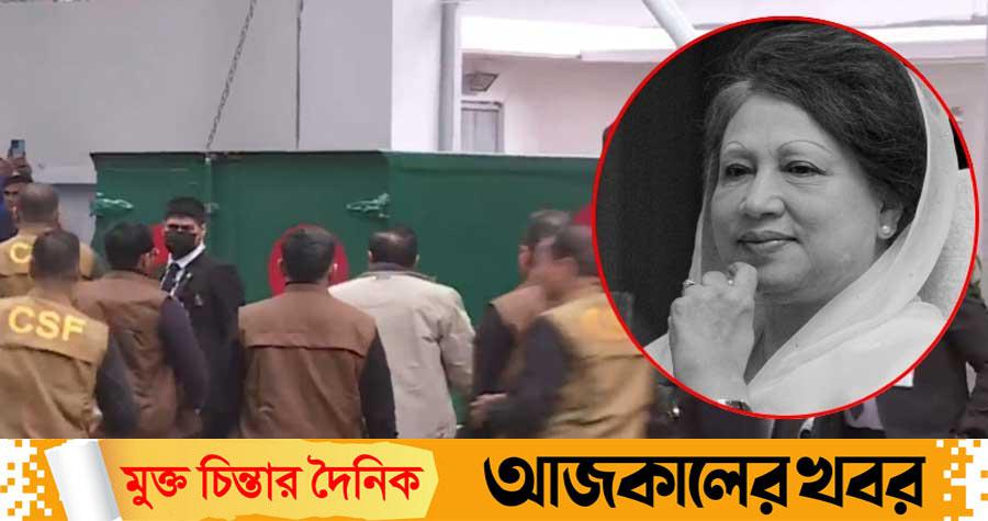 এর আগে সকাল ৯টার কিছু সময় আগে কড়া নিরাপত্তার মধ্য দিয়ে খালেদা জিয়ার মরদেহবাহী গাড়ি রওনা হয়। গাড়িতে মোড়ানো রয়েছে লাল-সবুজের দেশের পতাকা।