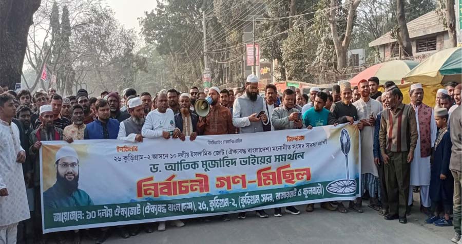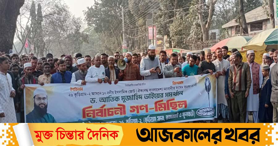 কুড়িগ্রাম-২ আসনে ১০ দলীয় ঐক্যজোটের মনোনীত সংসদ সদস্য প্রার্থী জাতীয় নাগরিক পার্টির কেন্দ্রীয় কমিটির যুগ্ম আহবায়ক ড. আতিক মুজাহিদ'র সমর্থনে নির্বাচনী গণ-মিছিল অনুষ্ঠিত হয়েছে।