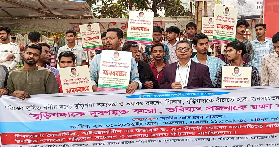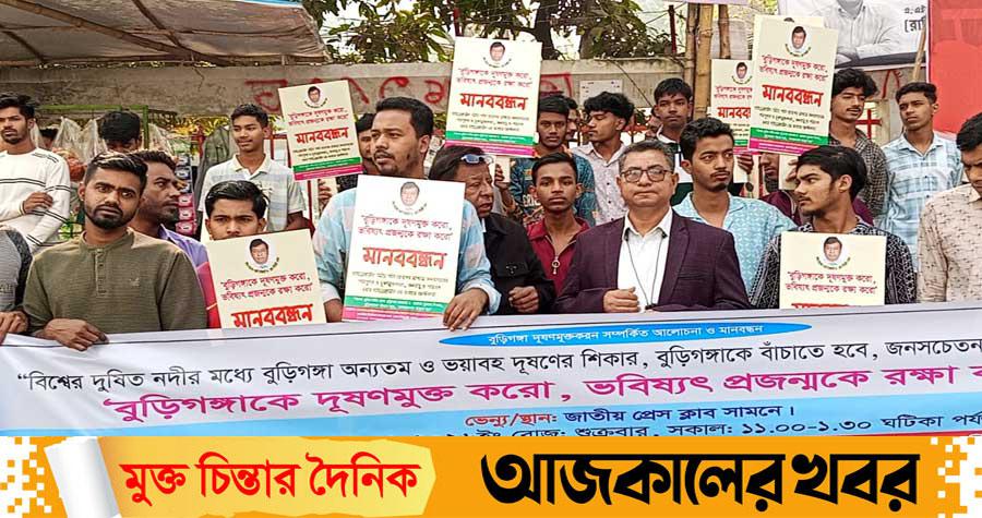 বিশ্বের অন্যতম দূষিত নদী হিসেবে পরিচিত বুড়িগঙ্গা বর্তমানে মারাত্মক পরিবেশগত সংকটের মুখে পড়েছে। নদীটি রক্ষা ও জনসচেতনতা বৃদ্ধির লক্ষ্যে “বুড়িগঙ্গা দূষণমুক্ত করো, ভবিষ্যৎ প্রজন্মকে রক্ষা করো” শীর্ষক ব্যানারে রাজধানীর জাতীয় প্রেসক্লাবের সামনে এক মানববন্ধন কর্মসূচি পালন করেছে সাধারণ জনগণ।