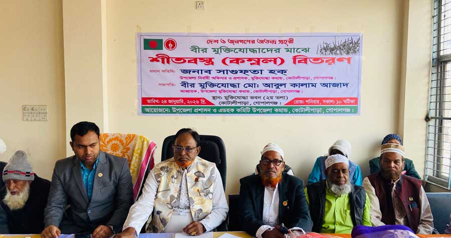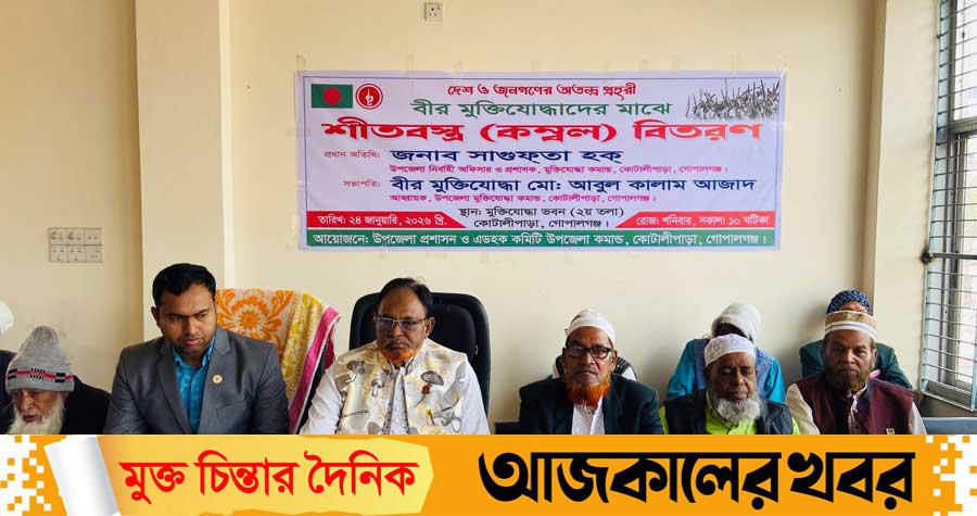 গোপালগঞ্জের কোটালীপাড়ায় বীর মুক্তিযোদ্ধাদের মাঝে কম্বল বিতরণ করা হয়েছে। শনিবার (২৪ জানুয়ারী)কোটালীপাড়া মুক্তিযোদ্ধা ভবনে কম্বল বিতরণের আয়োজন করেন উপজেলা প্রশাসন ও মুক্তিযোদ্ধা কমান্ডের এডহক কমিটি,কোটালীপাড়া উপজেলা মুক্তিযোদ্ধা কমান্ডের আহ্বায়ক বীর মুক্তিযোদ্ধা আবুল কালাম আজাদের সভাপতিত্বে শীতবস্ত্র (কম্বল) বিতরণ অনুষ্ঠানে প্রধান অতিথি হিসেবে উপস্থিত ছিলেন উপজেলা প্রাণিসম্পদ কর্মকর্তা ডা,মিরাজ হোসেন।অন্যান্যদের মধ্যে যুদ্ধাহত বীর মুক্তিযোদ্ধা আলাউদ্দিন তালুকদার (সদস্য, এডহক কমিটি), গ্রুপ কমান্ডার বীর মুক্তিযোদ্ধা আতিয়ার রহমান, বীর মুক্তিযোদ্ধা নরেন্দ্রনাথ বাড়ৈ,বীর মুক্তিযোদ্ধা মোদাচ্ছের হোসেন ঠাকুর এবং বীর মুক্তিযোদ্ধা গৌরাঙ্গ লাল চৌধুরী বক্তব্য রাখেন।