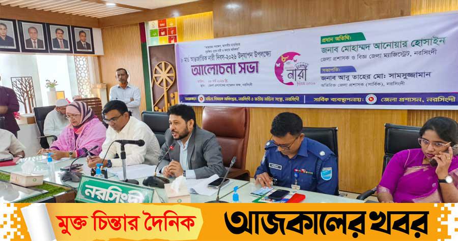 নরসিংদীতে মহিলা বিষয়ক অধিদপ্তর ও জাতীয় মহিলা সংস্থা আয়োজিত আন্তর্জাতিক নারী দিবস উদযাপন উপলক্ষ্যে আলোচনা সভা রবিবার (৮মার্চ) জেলা প্রশাসক সম্মেলন কক্ষে অনুষ্ঠিত হয়।