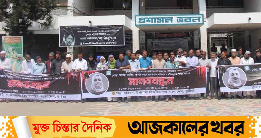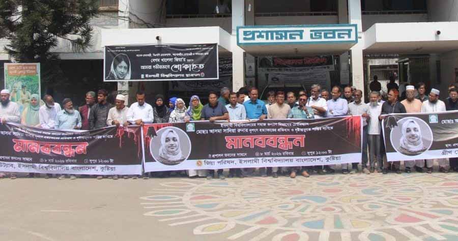 ইসলামী বিশ্ববিদ্যালয়ের (ইবি) সমাজকল্যাণ বিভাগের সহকারী অধ্যাপক ও বিভাগীয় সভাপতি আসমা সাদিয়া রুনা হত্যাকাণ্ডের প্রতিবাদ ও দ্রুত বিচারের দাবিতে মানববন্ধন করেছে শিক্ষক সংগঠনগুলো। এতে অংশ নেন বিএনপিপন্থি সংগঠন জিয়া পরিষদ, ইউট্যাব ও জামায়াতপন্থি সংগঠন গ্রীন ফোরাম।
