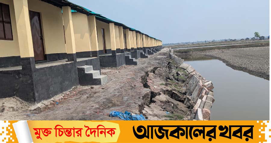 সরেজমিনে গিয়ে দেখা যায়, সারিবদ্ধভাবে নির্মিত আশ্রয়ণ প্রকল্পের ঘরগুলোর দুই পাশেই রয়েছে মৎস্য ঘের। ঘরের সামনে ও পেছনের অংশে মাটি ধসে বড় ধরনের ফাটল তৈরি হয়েছে। পাড় রক্ষায় স্থাপন করা প্যালাসাইডিংয়ের কিছু অংশও কাত হয়ে পড়েছে। এতে ভাঙন ধীরে ধীরে ঘরের কাছাকাছি চলে আসায় এলাকাবাসীর মধ্যে শঙ্কা তৈরি হয়েছে।