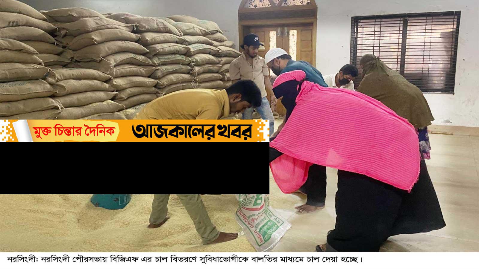 সকাল ৮টা থেকে চাল দেয়া কার্যক্রম শুরু করে নরসিংদী পৌর কর্তৃপক্ষ। লাইনে দাঁড়ানো নারী পুরুষ যার যার কার্ড জমা দিয়ে ১০ কেজি চাল প্রাপ্তির স্বাক্ষর সিটে টিপসহি প্রদান করে চাল নিয়ে চলে গেছেন। কর্তৃপক্ষ চালগুলো দিচ্ছেন সাদা রঙের চারটি বালতির সাহায্যে। অপর যে নীল রঙের বালতিটি রয়েছে তা দিয়ে কাউকেই চাল দেয়া হয়নি। তবে ওই বালতিটি চাল দিয়ে ভরে রাখা হয়েছিল।