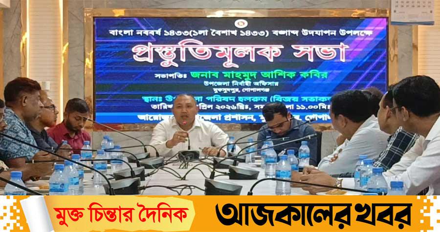 গোপালগঞ্জের মুকসুদপুরে বাংলা নববর্ষ উদযাপনের লক্ষ্যে এক প্রস্তুতিমূলক সভা অনুষ্ঠিত হয়েছে। বৃহস্পতিবার (২ এপ্রিল) সকালে মুকসুদপুর উপজেলা প্রশাসনের আয়োজনে উপজেলা পরিষদ (বিজয়) সভাকক্ষে এই সভা অনুষ্ঠিত হয়।