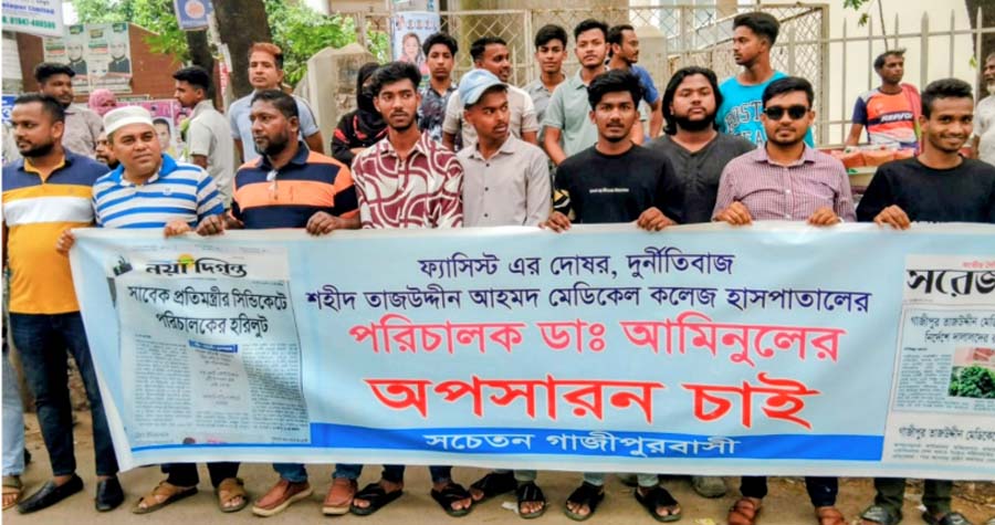‘সচেতন গাজীপুরবাসী’ ব্যানারে আয়োজিত কর্মসূচিতে অংশগ্রহণকারীরা বিভিন্ন স্লোগান দেন, যার মধ্যে ছিল- সাবেক প্রতিমন্ত্রীর সিন্ডিকেটে পরিচালকের হরিলুট এবং দুর্নীতিবাজ পরিচালকের অপসারণ চাই।