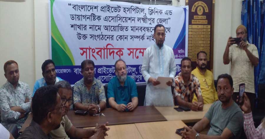 লক্ষ্মীপুরে বাংলাদেশ প্রাইভেট হসপিটাল ক্লিনিক এন্ড ডায়াগনস্টিক এসোসিয়েশন-এর নাম ব্যবহার করে আয়োজিত মানববন্ধনের প্রতিবাদে সংবাদ সম্মেলন করেছেন সংগঠনটির নেতৃবৃন্দ।