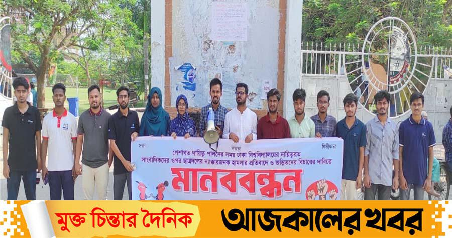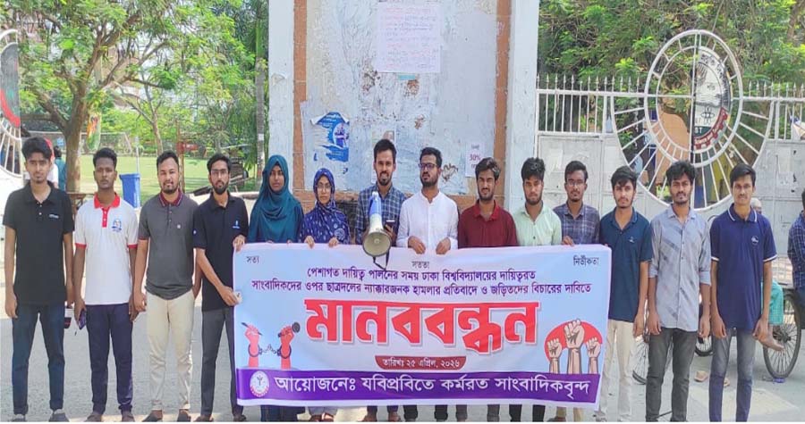 মানববন্ধনের সমাপনী বক্তব্যে যবিপ্রবিসাস সভাপতি ও বিশ্ববিদ্যালয়ের দৈনিক ইনকিলাব পত্রিকার প্রতিনিধি রুহুল আমিন বলেন, গত বৃহস্পতিবার শাহবাগ থানায় পেশাগত দায়িত্ব পালন করতে গিয়ে ঢাকা বিশ্ববিদ্যালয়ের কয়েকজন সাংবাদিক সহকর্মী ক্ষমতাসীন রাজনৈতিক দলের ছাত্র সংগঠন ছাত্রদলের ন্যাক্কারজনক হামলার শিকার হয়েছেন। আমরা এই বর্বরোচিত ঘটনার তীব্র নিন্দা ও ঘৃণা জানাই। দেশের অন্যতম শ্রেষ্ঠ বিদ্যাপীঠে দায়িত্ব পালনরত সাংবাদিকদের ওপর এমন হামলা শুধু দুঃখজনকই নয়, বরং মতপ্রকাশের স্বাধীনতা ও গণমাধ্যমের নিরাপত্তার ওপর সরাসরি আঘাত। আমরা অবিলম্বে জড়িতদের দৃষ্টান্তমূলক শাস্তি নিশ্চিত করার দাবি জানাচ্ছি এবং ভবিষ্যতে সাংবাদিকদের নিরাপদ কর্মপরিবেশ নিশ্চিত করতে সরকারের ওপর জোর দাবি জানাচ্ছি।