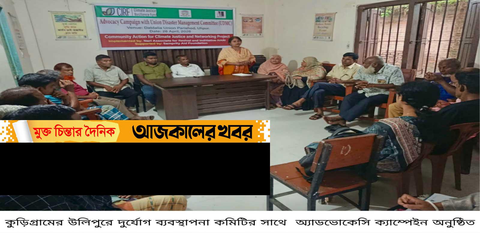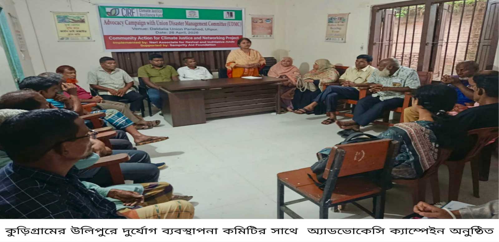 কুড়িগ্রামের উলিপুরে দুর্যোগ ব্যবস্থাপনা কমিটির সাথে অ্যাডভোকেসি ক্যাম্পেইন অনুষ্ঠিত হয়েছে। রবিবার (২৬ এপ্রিল) দুপুরে উপজেলার দলদলিয়া ইউনিয়ন পরিষদের হলরুমে কমিউনিটি এ্যাকশন ফর ক্লাইমেট জাস্টিস অ্যান্ড নেটওয়ার্কিং প্রকল্পের আওতায় ক্লাইমেট জাস্টিস রেজালিয়ান্স ফান্ড এর অর্থায়নে, সম্প্রীতি এইড ফাউন্ডেশন এর কারিগরি সহযোগিতায় নারী এ্যাসোসিয়েট ফর রিভাইভাল এন্ড ইনিশিয়েটিভ- নারী সংগঠনের বাস্তবায়নে এই ক্যাম্পেইন অনুষ্ঠিত হয়।