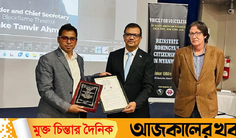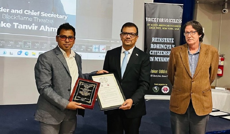 রোহিঙ্গা পরিস্থিতি নিয়ে কাজ করা বিশ্বের সবচেয়ে বড় দুটি সংস্থা আরাকান রোহিঙ্গা ইউনিয়ন ও বার্মিজ রোহিঙ্গা এসোসিয়েশন অব নর্থ আমেরিকা এর আয়োজনে রোহিঙ্গাদের নিজ দেশ মিয়ানমারে ফেরাতে জাতিসংঘের সাধারণ অধিবেশন চলাকালীন নিউইয়র্কে অনুষ্ঠিত তিন দিনব্যাপী আয়োজনের শেষ দিন আরম্বরপূর্ণ অনুষ্ঠানের মাধ্যমে ওজন পার্ক এলাকার একটি কনভেনশন হলে (৭৪০২ লিবার্টি এভিনিউ) গত ১৯ সেপ্টেম্বর ২০২৩ সন্ধ্যা ৭টায় আমন্ত্রিত অতিথী ও গনমাধ্যমের উপস্থিতিতে তার হাতে সম্মাননা স্মারক ও মানপত্র তুলে দেন আরাকান রোহিঙ্গা ইউনিয়ন এর মহাপরিচালক জনাব রিয়াজ উদ্দিন ও বার্মিজ রোহিঙ্গা এসোসিয়েশন অব নর্থ আমেরিকা এর ভাইস চেয়ারম্যান মোঃ আসাহাব দীন।
