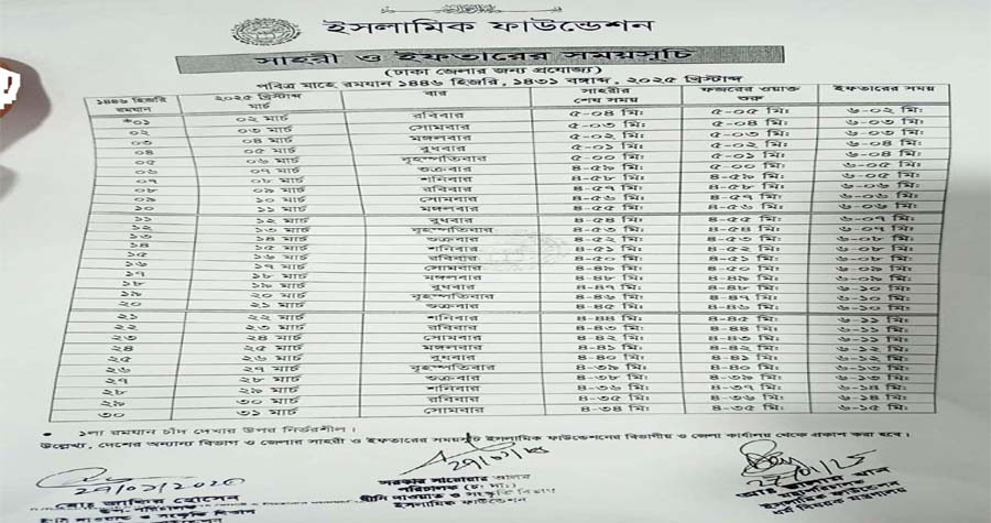 দ্বীনি দাওয়াত বিভাগের কর্মকর্তারা জানিয়েছেন, দেশের অন্যান্য বিভাগ ও জেলার সেহরি-ইফতারের সময়সূচি ইসলামিক ফাউন্ডেশনের বিভাগীয় ও জেলা কার্যালয় থেকে প্রকাশ করা হবে।